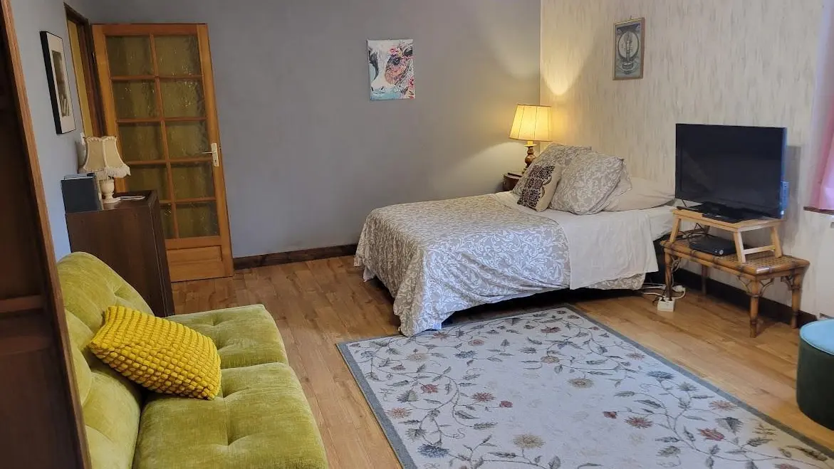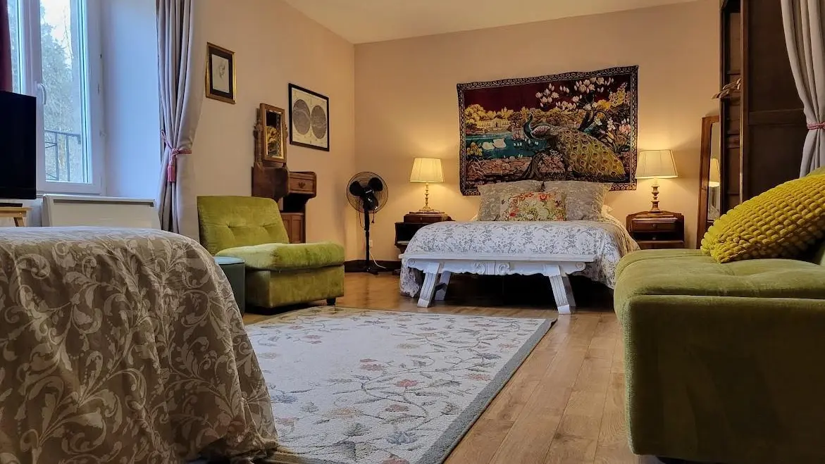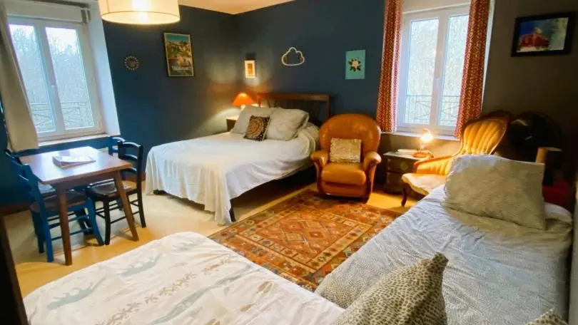 Located in the charming village of Treignac, The Loft is perfect for a cosy stay, ideal for a couple. Housed in a renovated old mill, this flat offers a unique and welcoming atmosphere. The mezzanine has a king-size bed, and downstairs there is a single bed. The building is also home to the owner, ensuring a warm welcome and local advice to help you make the most of your stay. Although located near a main road, the studios enjoy a peaceful setting thanks to the river that flows just behind, reminiscent of the building's past as a mill. In summer, you can even see canoes gliding peacefully along the water. A large garden is just a 3-4 minute walk behind the building, equipped with garden furniture and a hammock, perfect for relaxing. Although located near a main road, the Family Room enjoys a peaceful setting thanks to the river that flows just behind it, reminiscent of the building's pas