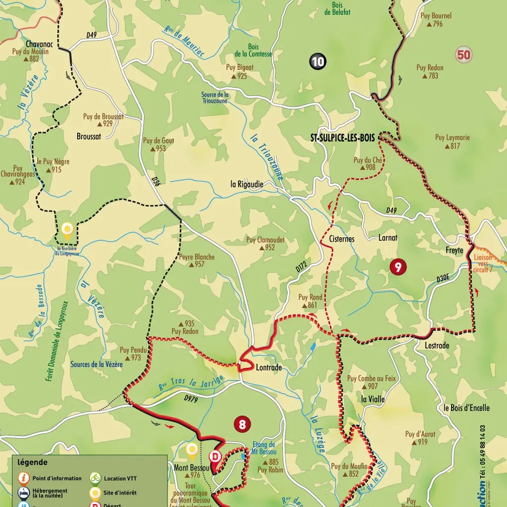 Espace VTT Haute-Corrèze, circuit VTT n°8 (16 km) au départ du mon Bessous. Avec plus de 1000 kilomètres de circuits balisés au départ de 17 communes, l’Espace VTT Haute-Corrèze est le plus grand réseau labellisé FFCT de France. Les 50 circuits familiaux ou réservés à des pratiquants avertis, ont une longueur de 4 à 51 km avec des dénivelés de 10 à plus de 1000 mètres. Paysages à vous couper le souffle, points de vue sur les Monts d’Auvergne et du Sancy, détours par les sites touristiques naturels majeurs du Plateau de Millevaches : tourbières du Longeyroux et de Négarioux, gorges du Chavanon et de la Diège… Des liaisons entre les circuits permettent de réaliser des étapes avec des points de départ et d’arrivée différents. Des parcours sur plusieurs jours sont possibles avec des solutions d’hébergement à proximité (campings, gîtes, chambres d’hôtes, village vacances…). Point de location