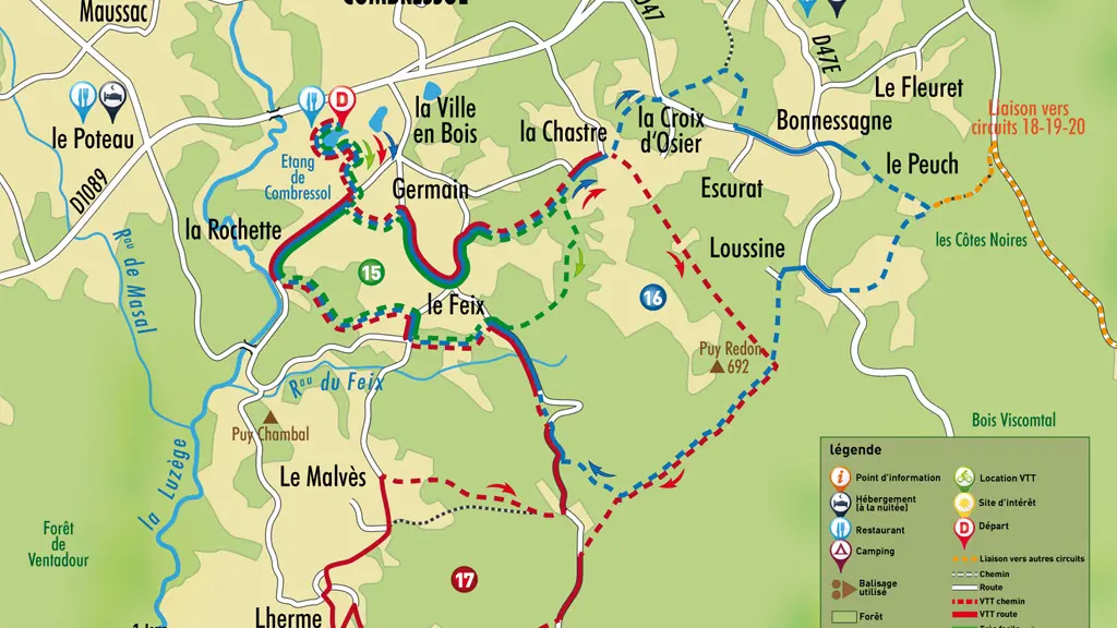 Espace VTT Haute-Corrèze, mountain bike circuit n°16 (11 km) starting from the pond of Combressol. With more than 1,000 kilometres of signposted circuits starting from 17 communes, the Espace VTT Haute-Corrèze is the largest FFCT labelled network in France. The 50 circuits, which are either family-friendly or reserved for experienced riders, range in length from 4 to 51 km with gradients from 10 to over 1000 metres. Breathtaking landscapes, views of the Monts d'Auvergne and Sancy, detours through the major natural tourist sites of the Plateau de Millevaches: the Longeyroux and Négarioux peat bogs, the Chavanon and Diège gorges, etc. Links between the circuits allow you to ride stages with different starting and finishing points Itineraries over several days are possible with accommodation solutions nearby (campsites, gîtes, bed and breakfast, etc.).